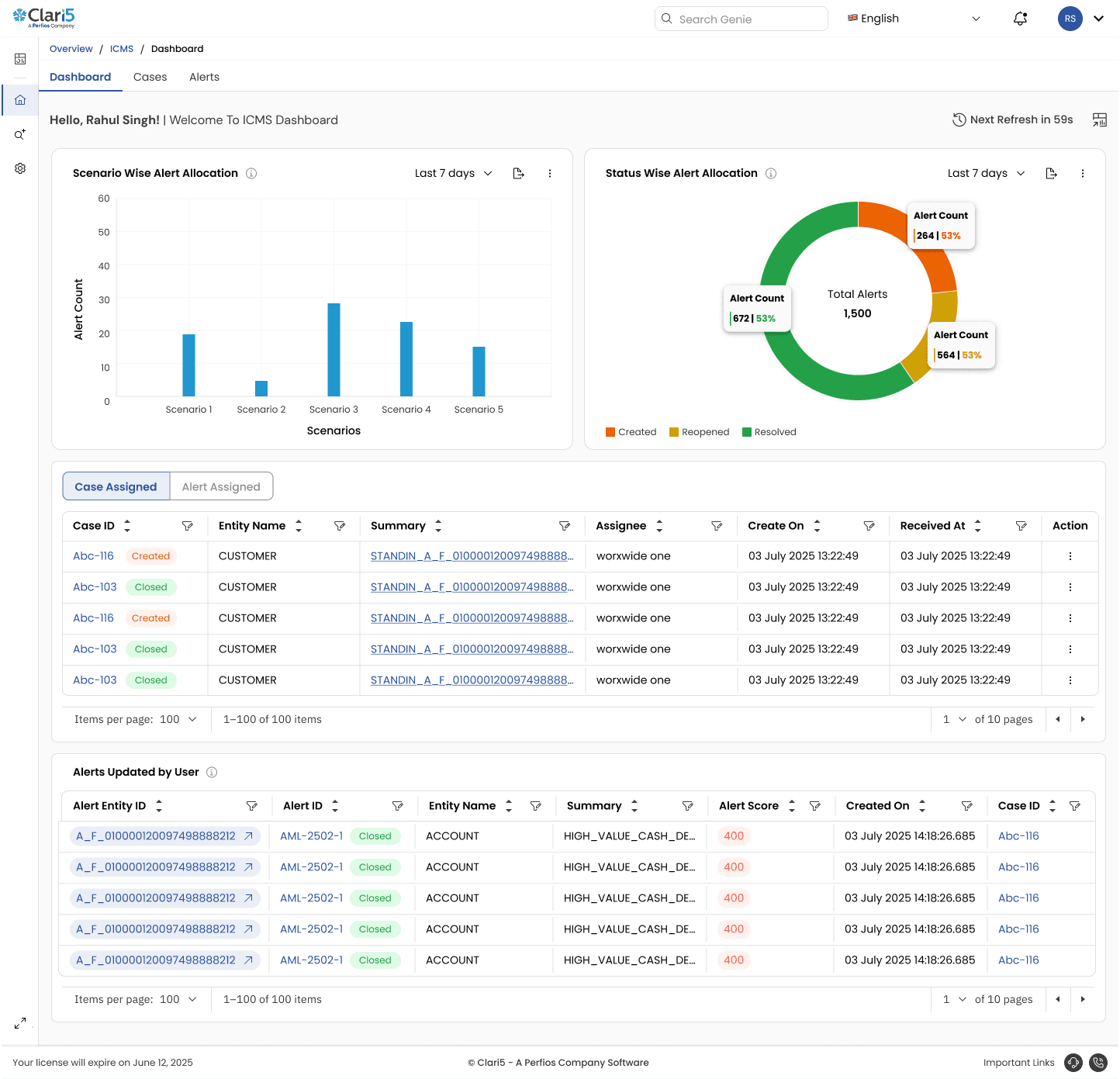 5.) Added visual graphs : bar chart for scenario-wise alert distribution, donut chart for status breakdown, helping analysts spot patterns quickly.